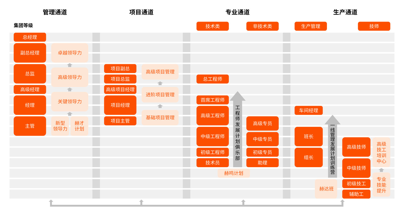 員工根據自己的定位、優(yōu)勢和公司的發(fā)展需求,可以在管理、項目、專業(yè)、生產等多個通道進行發(fā)展,可以充分發(fā)揮個人的優(yōu)勢和價值,取得職業(yè)發(fā)展的成功